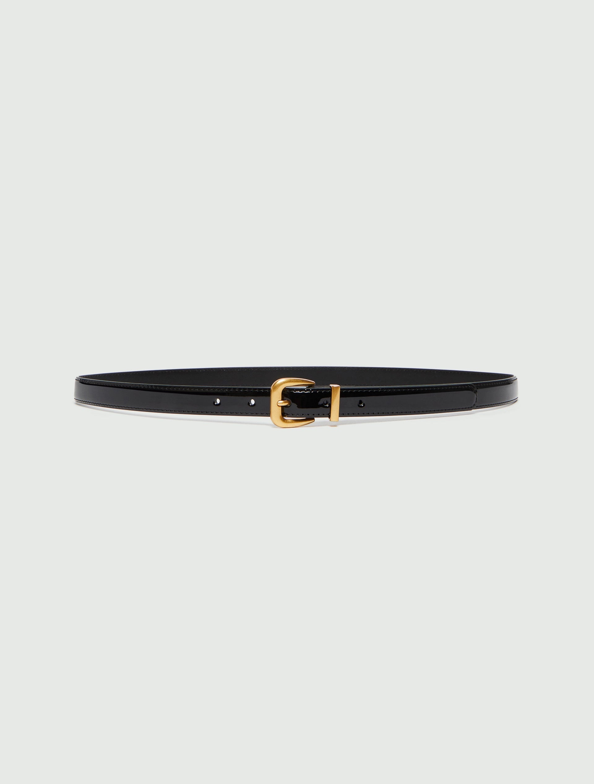 Cintura sottile lucida Emme Marella Estro 003, ecopelle, tintura in tessuto spalmato, fibbia stondata con finitura dorata, passante in metallo con finitura dorata, altezza 1,8 cm.