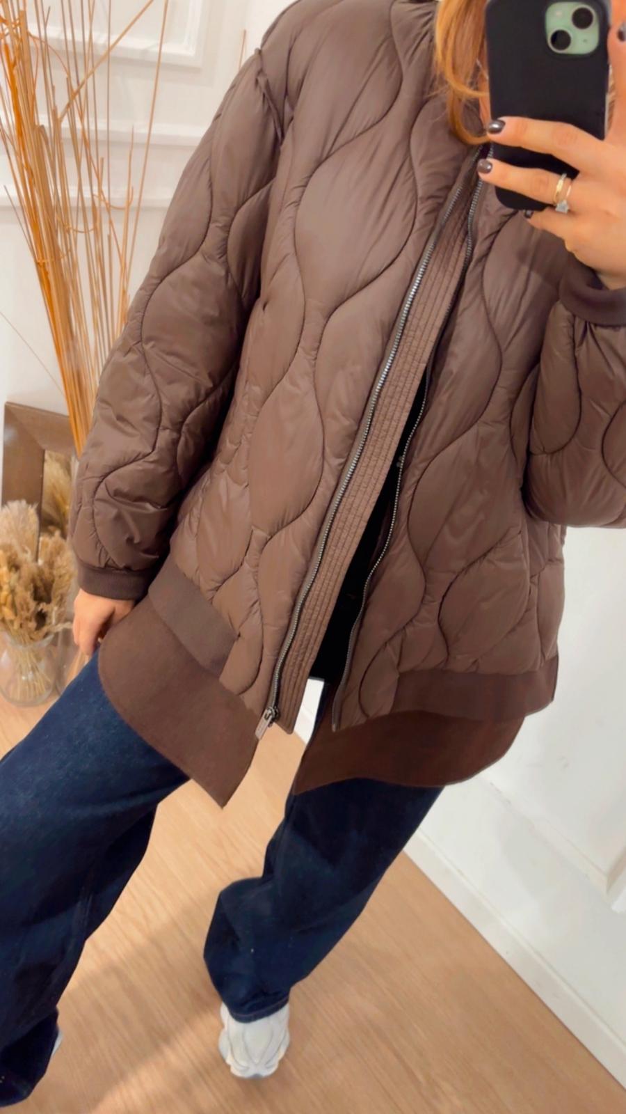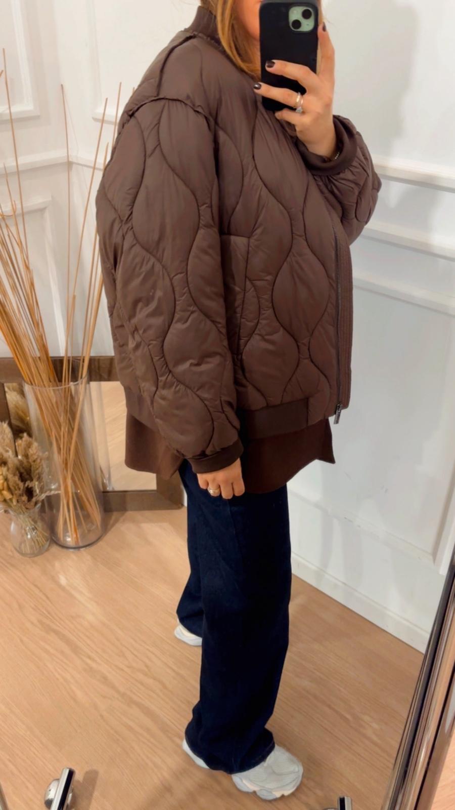 Giacca trapuntata Vicolo TF0045 moro, con collo alla coreana elasticizzato a costine come polsini e fondo, zip, fondo in panno non rimovibile, vestibilità over.