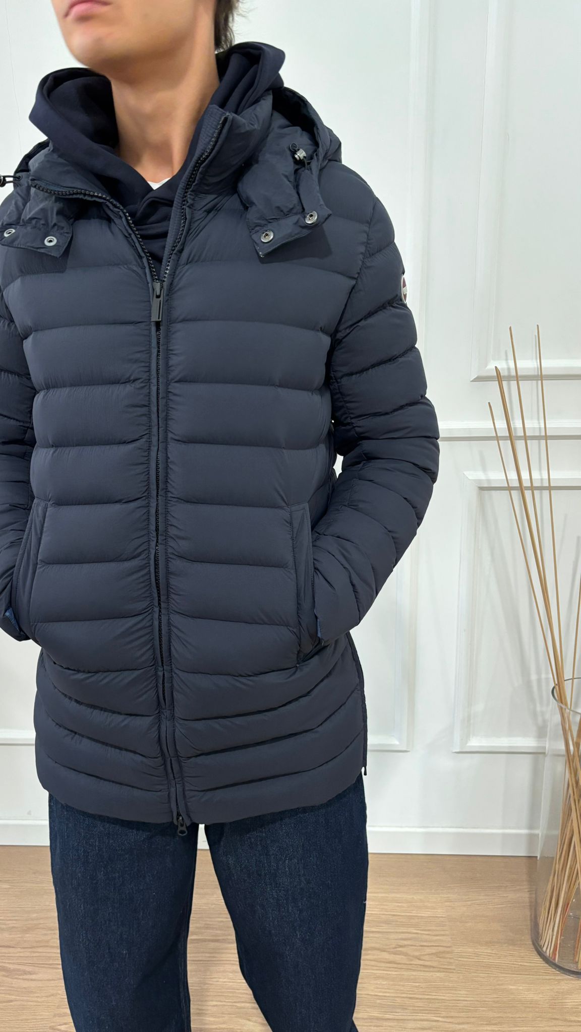 Piumino lungo cappuccio staccabile 1264 Colmar blu con chiusura con zip doppio cursore, cappuccio staccabile con coulisse di regolazione, tasche laterali con zip, tasca interna con zip, spacchetti laterali con zip, imbottitura in piuma naturale, tessuto 100% riciclato, logo Colmar Originals applicato sulla manica sinistra, patch "C" applicato sul retro.