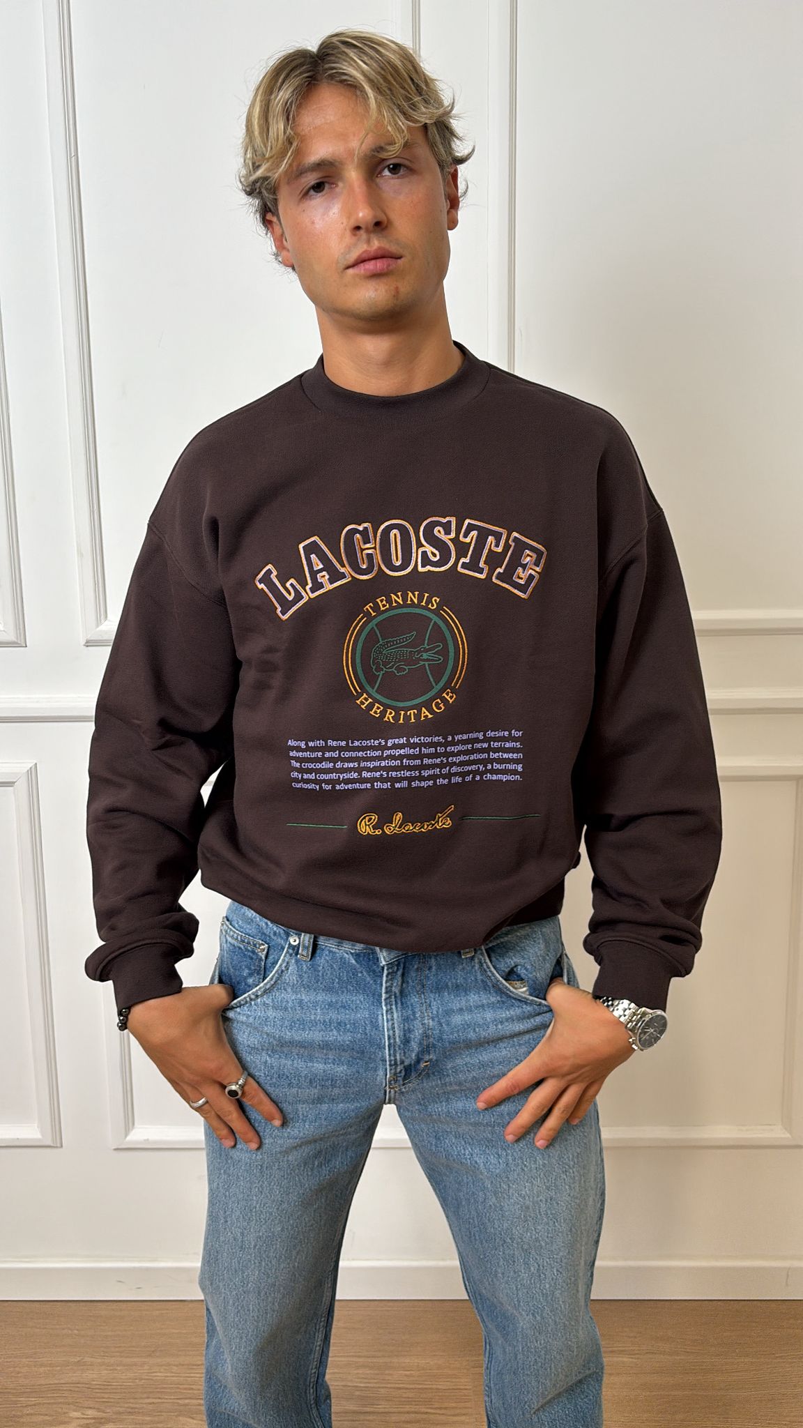Felpa con ricamo Heritage Lacoste SH5888 in cotone felpato organico, loose fit, spalle scese, stampe sul davanti, ricamo Tennis Heritage sul davanti, coccodrillo ricamato sotto il collo sul retro.
