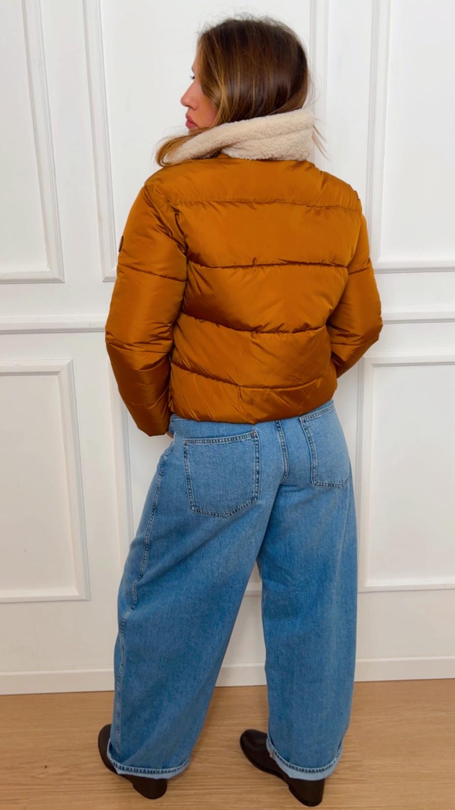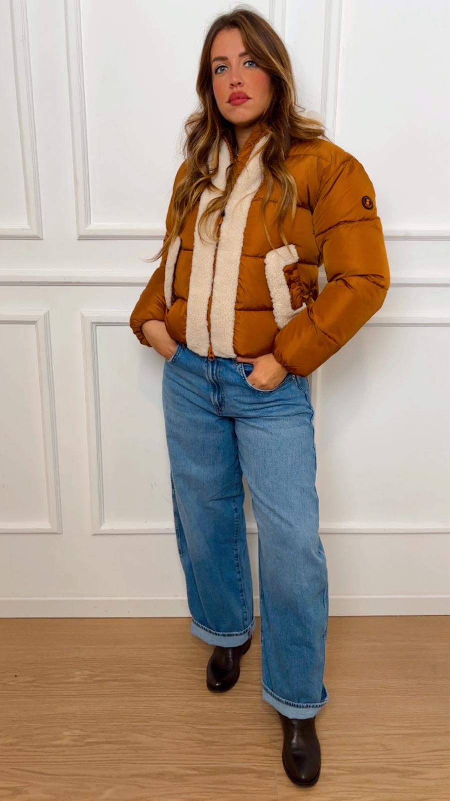 Giacca Mega21 Save the Duck D32338W 40044 con dettagli in teddy sul collo, trapuntato e confortevole, tasche con bottoni a pressione, polsi e fondo elasticizzati, e logo tondo arancione sulla manica.