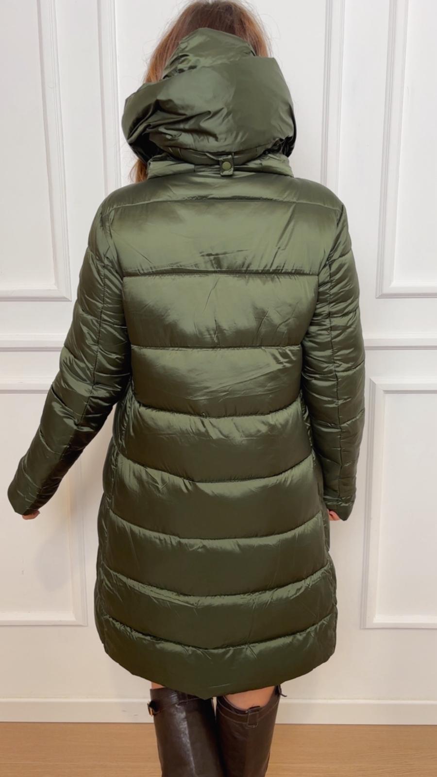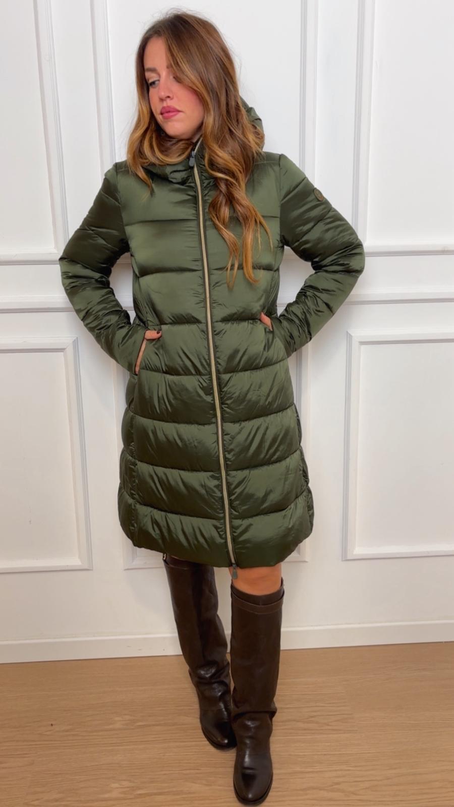 Giubbotto Iris21 Save the Duck D40279W 50023 dalla silhouette extra lunga, che assicura copertura, comfort e leggerezza, collo alto e arricciato che nasconde il cappuccio grazie a una pratica chiusura con bottone a pressione, tasche laterali con zip invisibili, logo rotondo sulla manica e tiretti personalizzati tono su tono.