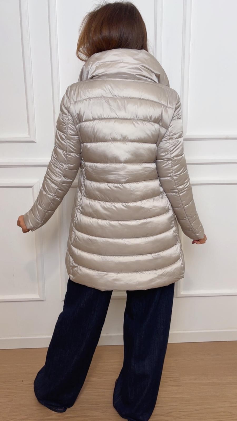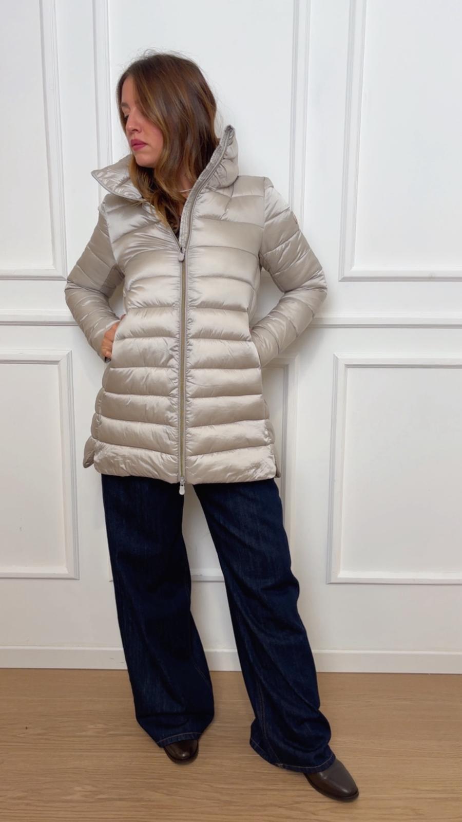 Giubbotto Iris21 Save the Duck D43620W 40019 in nylon brillante, collo voluminoso e linea ad A, trapuntato orizzontale, caldo e leggero, tirazip personalizzato e logo rotondo sulla manica sinistra, entrambi tono su tono.