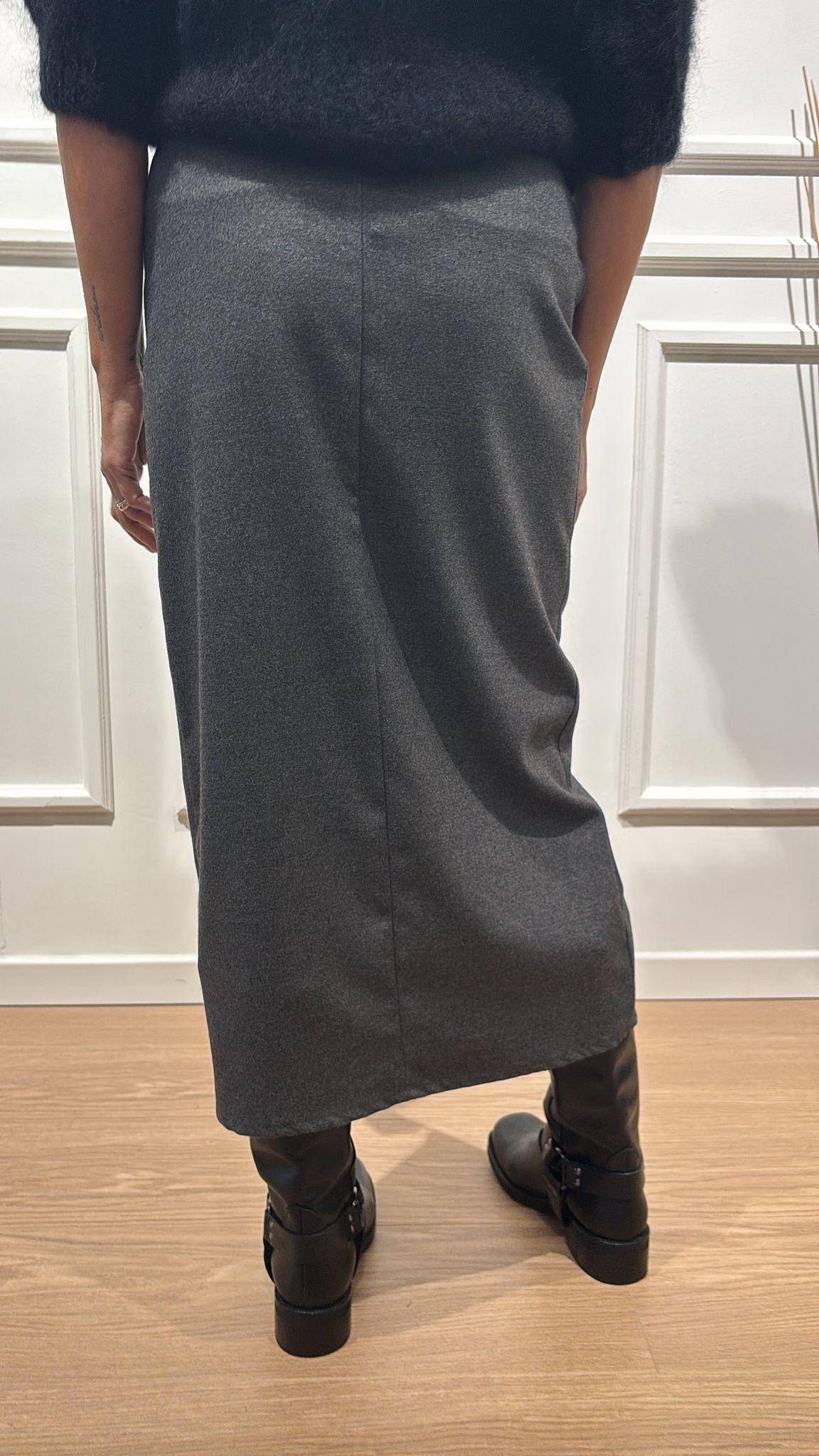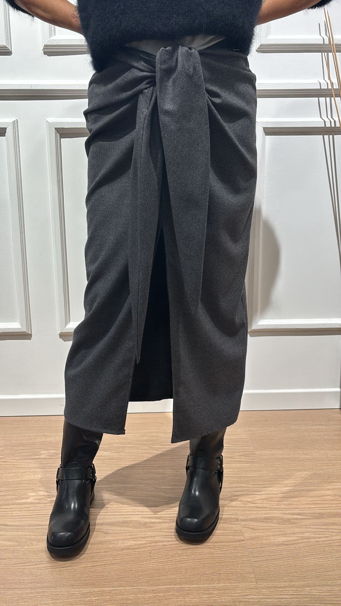 Gonna spacco e fiocco Dixie GDDLYNV grigia, vita alta, impreziosita da un nodo frontale che dona un tocco originale e da uno spacco anteriore che movimenta la silhouette.