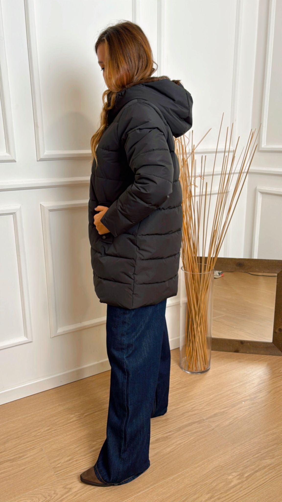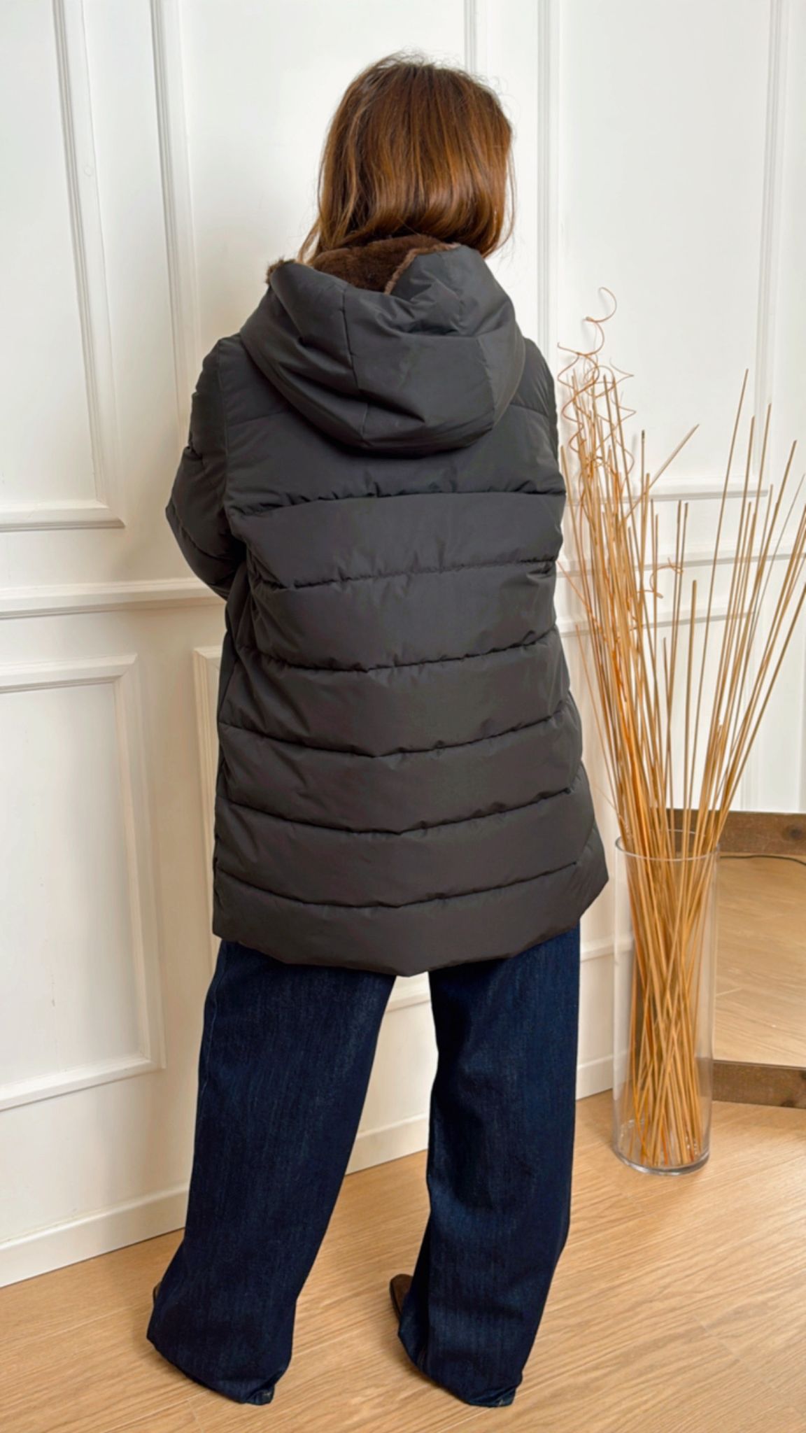 Piumino in taffetà Gebel 005 Emme Marella caldo e versatile, con trapuntature orizzontali, fit dritto, collo alto con cappuccio e dettagli interni in tessuto morbido, chiusura con full zip a vista, tasche laterali con patta e bottoni